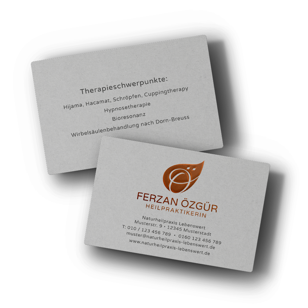 Gestaltung und Druckbetreuung von Visitenkarten mit Kupfer-Heißfolienprägung.